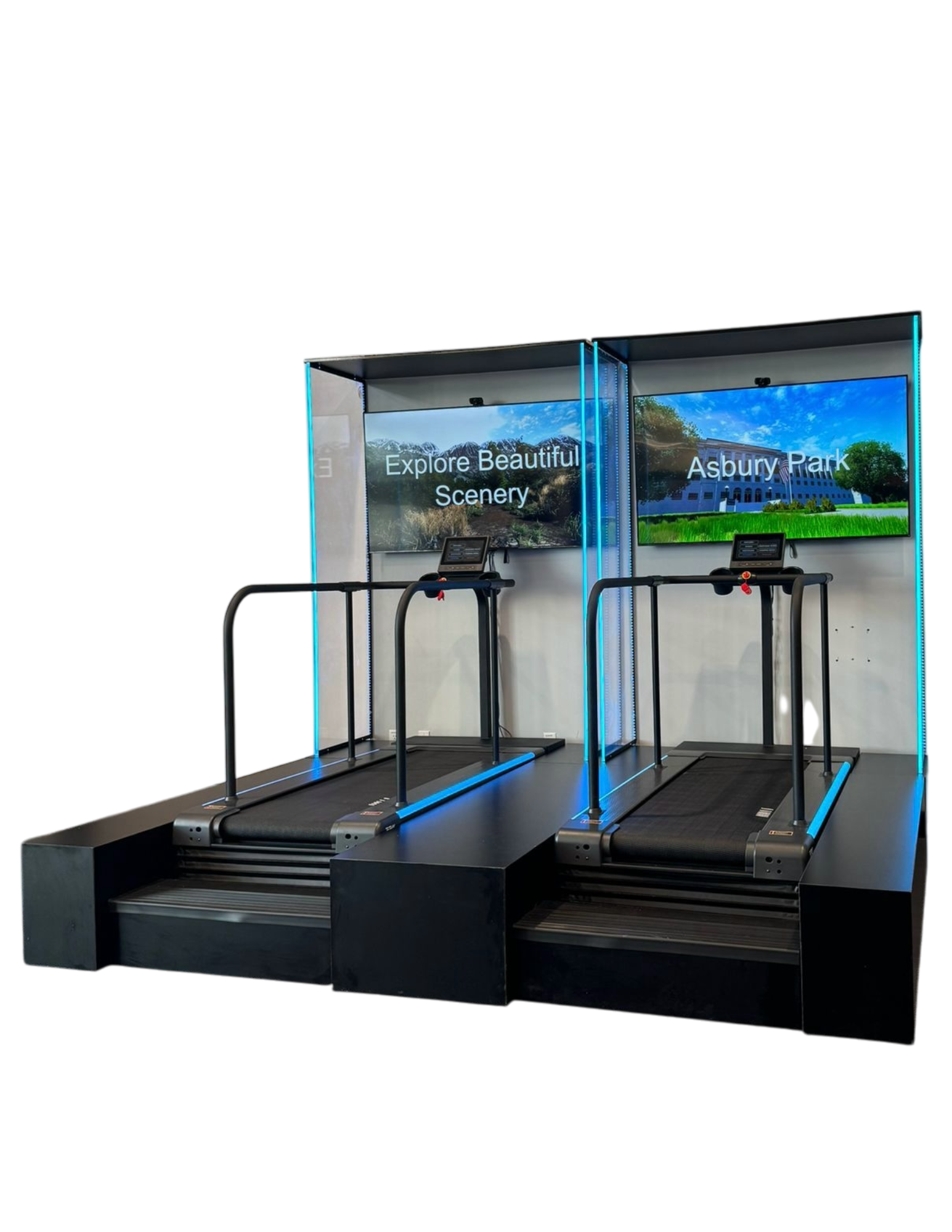 The booth provides the best expression of this innovative platform creating a semi-private enclosure while still giving the user the ability to communicate with adjoining users, the booth can be a standout presence in your facility. The beacon effect provided by the additional LEDs that are also coordinated with the deck LEDs creates an automatic focal point from as far 50-100ft. in a busy facility and also enhances our product's ability to act as an advertising screen when not being used. The booths can be configured as side-by-side or in other configurations depending on space and design considerations.